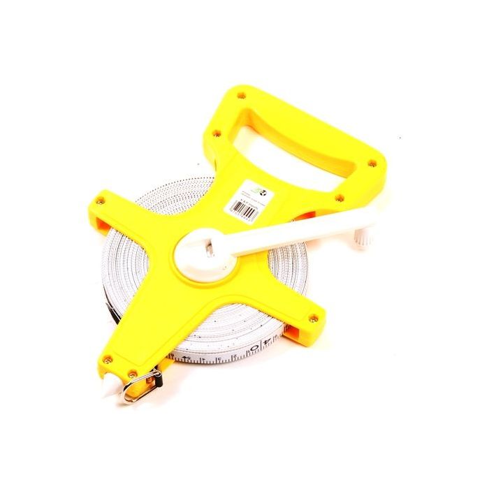 Landmeter 30 meter. Groot meetlint met duidelijke schaalverdeling in feet en meters. Met de houder gemakkelijk op te rollen.